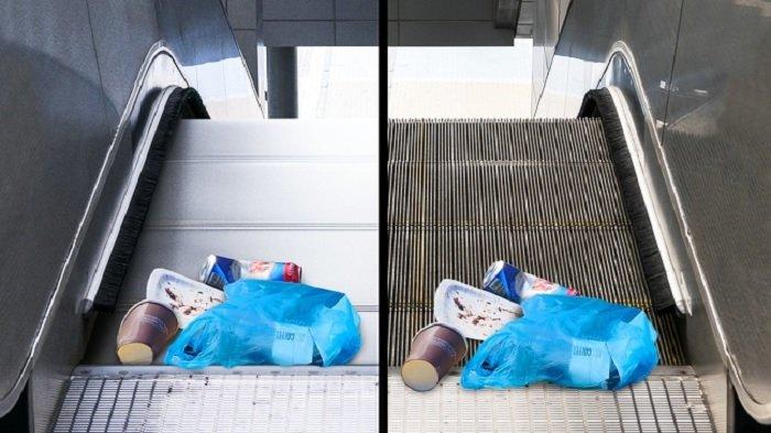 Biasanya, ada juga sampah bungkus permen atau tiket yang jatuh di eskalator.
