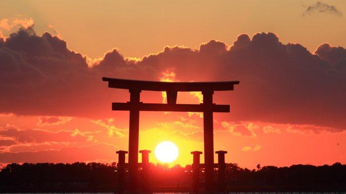 Matahari Terbenam Melewati Torii Dihiasi Langit Berwarna Merah