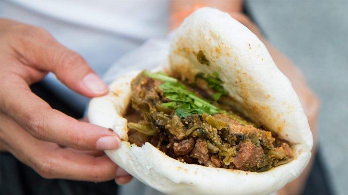 Gua bao terbuat dari roti kukus yang diisi dengan daging babi, acar, dan kacang tanah.