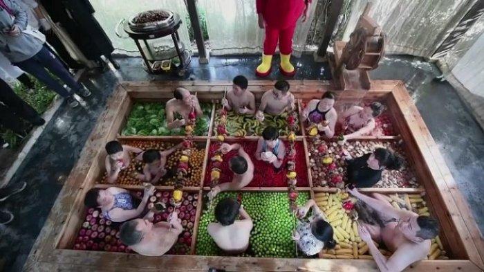 Kolam hotpot di China ini membuat para pengunjung mandi bersama buah dan sayur-sayuran.