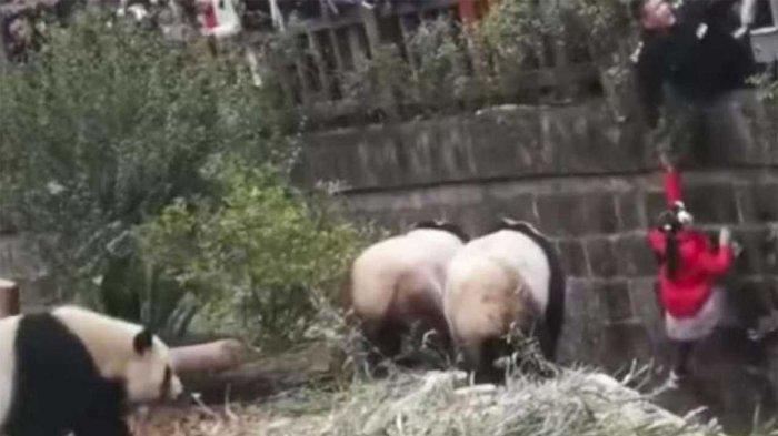 TRIBUNTRAVEL.COM - Seorang gadis kecil terjatuh ke dalam kandang panda di pusat penangkaran panda di Chengdu, Sichuan, China Barat Daya, Sabtu (9/2/2019).