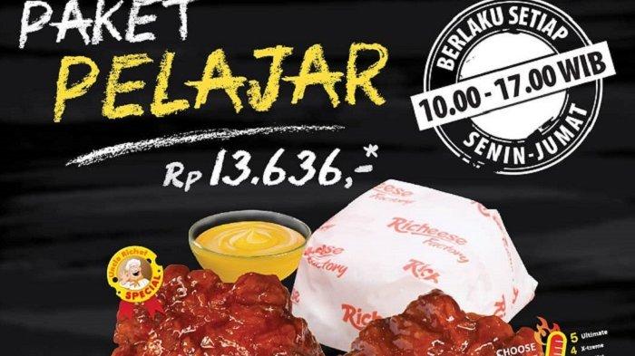 Nikmati promo paket pelajar Richeese Factory hanya dengan harga Rp 13.636, tidak termasuk minum.