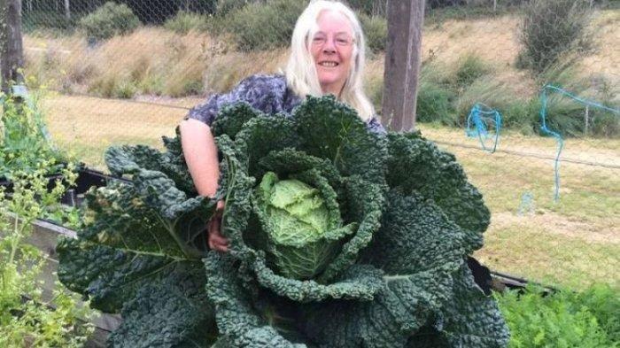 Rosemary Norwood mengunggah foto sebuah kubis raksasa berwarna hijau seukuran manusia dan tampak kesulitan dia bawa.
