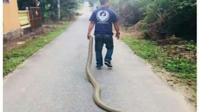 Foto yang menampilkan seorang pria memegang ular king kobra sepanjang 4 meter sambil berjalan santai di jalan sempit menjadi viral di media sosial (medsos) dan whatsapp (WA)
