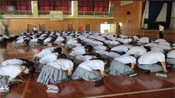 Dalam foto tersebut terlihat para siswa harus melakukan seiza (berlutut ala Jepang) dan membungkuk ketika guru berada di hadapan mereka.