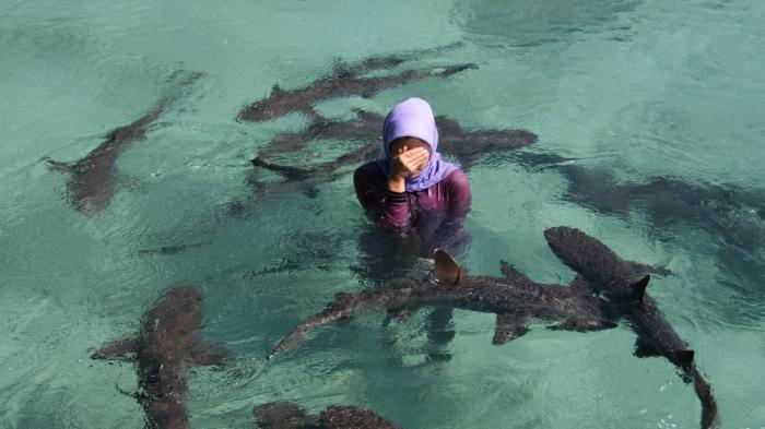 Ikan hiu ditangkarkan hingga jinak dan bersahabat dengan manusia.