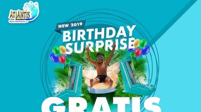 Promo Birthday Surprise dari Atlantis Water Adventures menawarkan promo tiket gratis bagi yang berulang tahun pada April 2019.