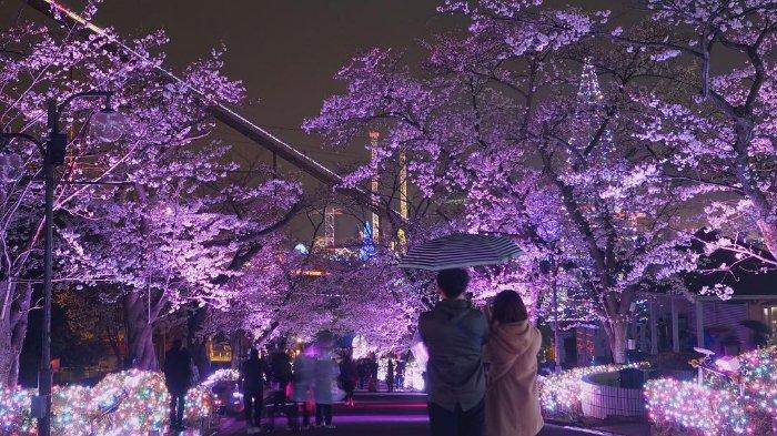 Kalau biasanya para wisatawan menikmati keindahan bunga sakura pada waktu siang atau sore hari, ada satu destinasi baru untuk melihat keindahan bunga sakura pada malam hari.