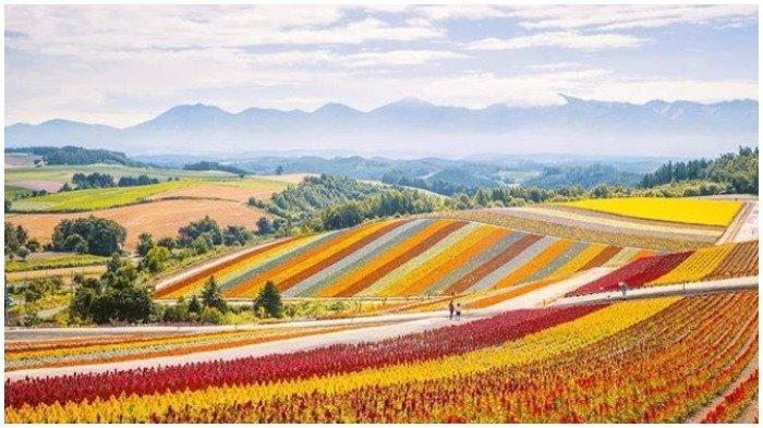 Hamparan bunga di Bukit Biei Hokkaido warnanya akan sangat terang dan mempesona.