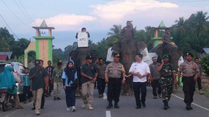Gajah-gajah ini dihadirkan untuk mengantarkan logistik menujuke TPS di Gampong Naca, Kecamatan Trumon Timur, Kabupaten Aceh Selatan, Rabu (17/4/2019).