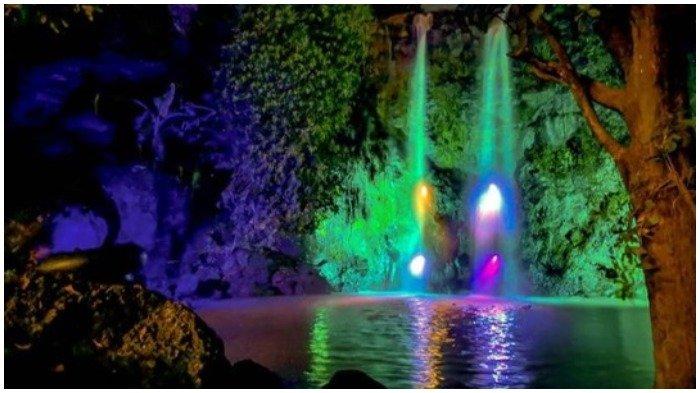 Perpaduan derasnya air terjun dengan kilauan cahaya warna-warni membuat suasana malam di Curug Gondoriyo semakin eksotis.