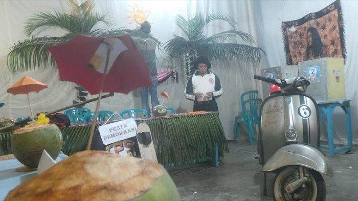 Di atas pintu depan, calon pemilih disambut tulisan berukuran tak begitu besar 'PESTA DEMOKRASI Ciptakan Suasana Damai Seperti di Pantai'. Kesan yang santai yang hendak diciptakan oleh kelompok penyelenggara pemungutan suara (KPPS) setempat begitu menonjol, kuat.