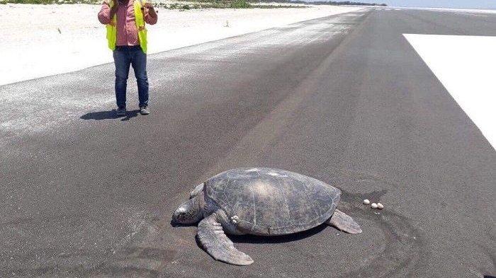 Penyu hijau tadi akhirnya terpaksa bertelur di bandara yang sedang dibangun di kawasan tersebut.