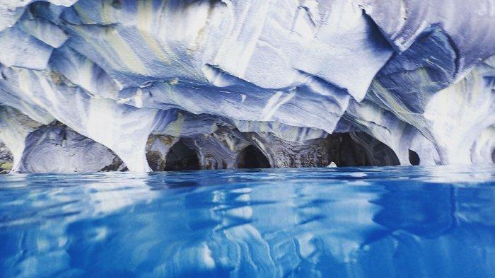 TRIBUNTRAVEL.COM - Cuevas de Marmol adalah gua yang memiliki lanskap cantik dan berbeda dengan gua lainnya yang berada di Danau Carrera, Patagonia Chile.