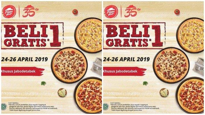Pizza Hut menggelar promo buy 1 get 1 selama tiga hari yang berlaku mulai tanggal 24-26 April 2019.
