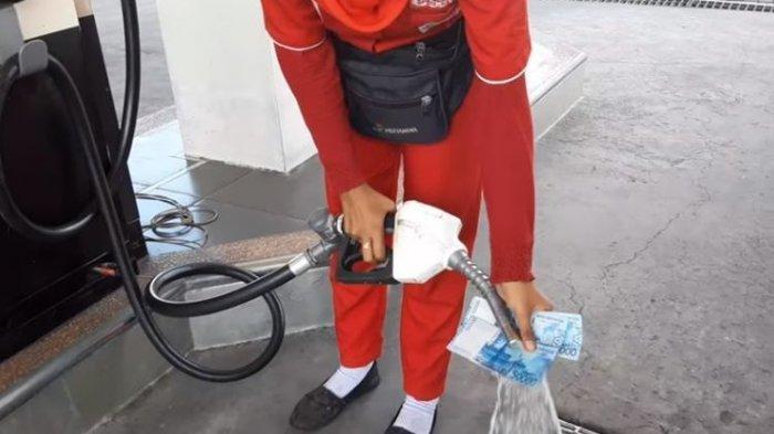 Petugas SPBU meminta izin kepada Ahmad untuk menyiram satu lembar uang Rp 50.000 menggunakan bensin untuk membuktikan bahwa uang tersebut merupakan uang palsu.