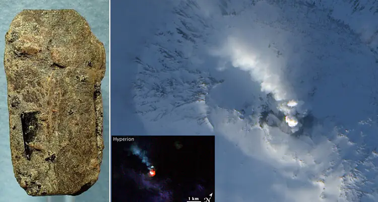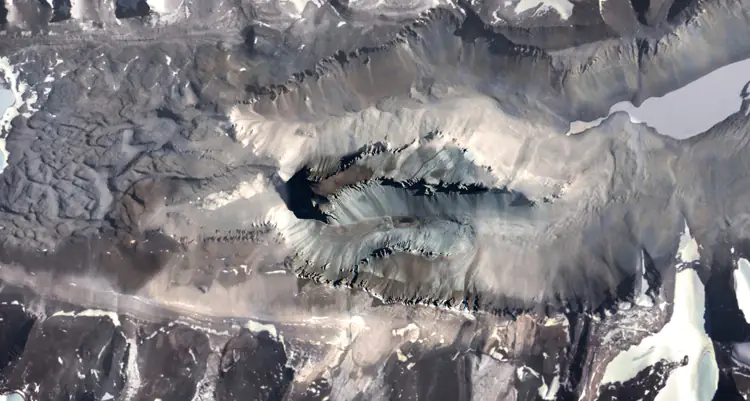 Gunung Erebus merupakan gunung paling aktif di Kutub Selatan dan ditutupi kristal yang dikeluarkan dari gunung dalam bentuk bom vulkanik kaca.