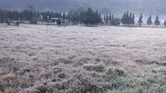 Kemunculan kembang es di permukaan rumput di komplek Candi Arjuna, Setyaki, dan kebun kentang di sekitarnya menampakkan hamparan putih keabu-abuan.
