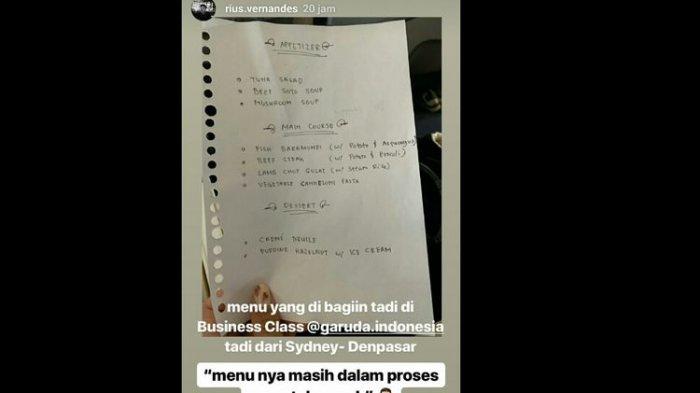 Dalam foto itu, ia menambahkan keterangan "Menu yang dibagiin tadi di Business Class @garuda.indonesia tadi dari Sydney-Denpasar. Menunya masih dalam percetakan Pak."