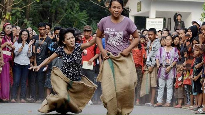 Balap karung menjadi salah satu lomba yang populer di HUT ke-74 RI.