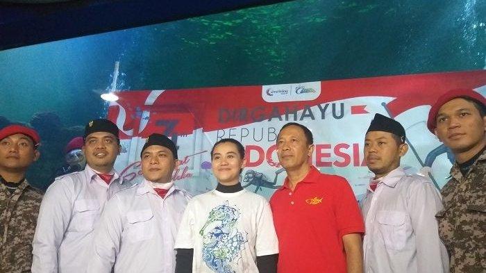 TRIBUNTRAVEL.COM - Penyanyi muda Aaliyah Massaid menjadi pengibar bendera di acara Pengibaran Bendera Merah Putih di Akuarium Raksasa, Seaworld Ancol, Jakarta Utara.