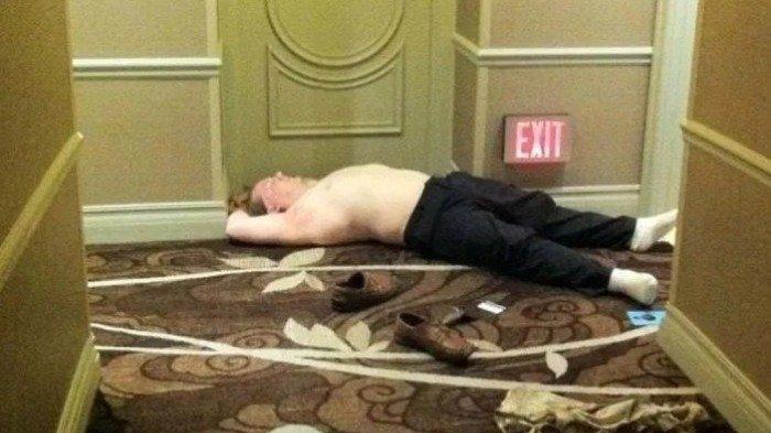Pria ini tidak peduli dengan waktu check out kamarnya, dan malah tidur di lorong hotel tanpa beban pikiran.