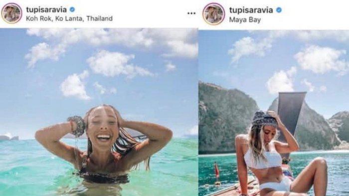 Dua dari foto tersebut ditandai di Pantai Maya dan Koh Rok di Thailand, sedangkan gambar lainnya menunjukkan Saravia mengendarai perahu di Porto Santa Margherita Italia.