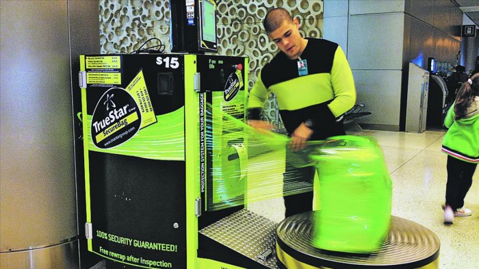 Di bandara, pelayanan jasa plastik bagasi dapat dilakukan sesaat sebelum memasukkan barang ke tempat check in pengumpulan barang.