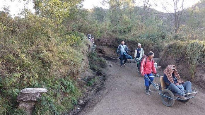 Jasa taksi bertenaga manusia tersedia di jalur pendakian Gunung Ijen, Jawa Timur.