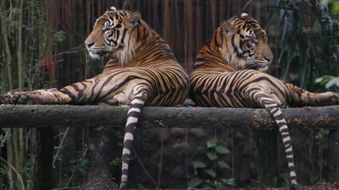 Sepasang Harimau Sumatera (Panthera tigris sumatrae) di Taman Margasatwa Ragunan, Jakarta, Selasa (16/3). Perburuan liar dan perdagangan gelap merupakan ancaman paling serius yang dihadapi satwa dilindungi tersebut saat ini yang kian mendekati kepunahan.