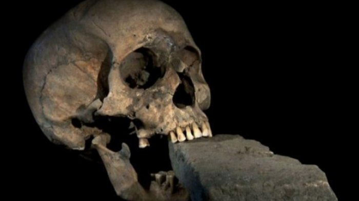 Di atas tanah tersebut terdapat replika tengkorak manusia yang masih mengenakan pakaian.