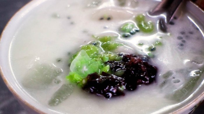 Semangkuk minuman bersantan ini terdiri dari ketan hitam, tape ketan, jenang sumsum, biji telasih, dan tentunya dawet.