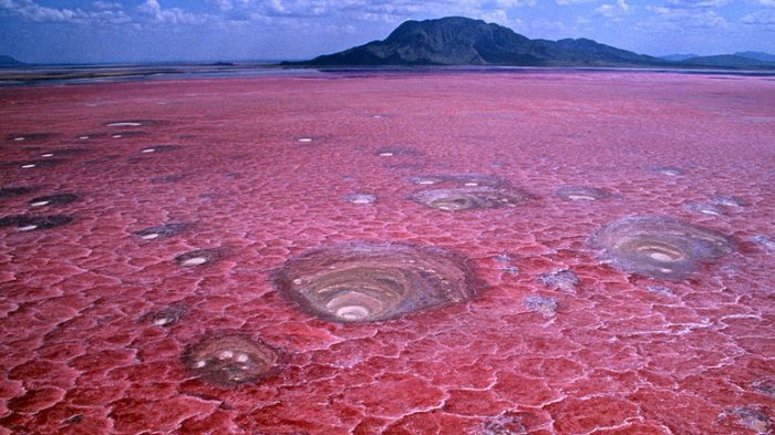 Alasan danau Natron berwarna merah adalah adanya cyanobacteria yang bisa tinggal di sana, teman-teman.