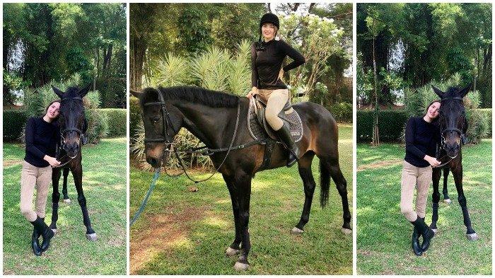 Selama olahraga berkuda, Nia Ramadhani terlihat selalu mengenakan kaus hitam polis dengan perlengkapan lainnya.
