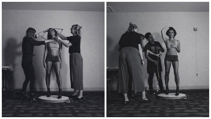 Terlihat Tim Madame mengukur beberapa bagian tubuh Agnez Mo seperti kepala dan leher hingga tinggi tubuh dari Agnez Mo.