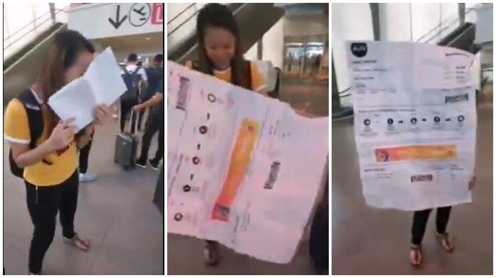 Sang petugas tersebut terlihat bingung sembari tersenyum melihat tiket pesawat berukuran raksasa yang dibawa oleh perempuan tersebut.
