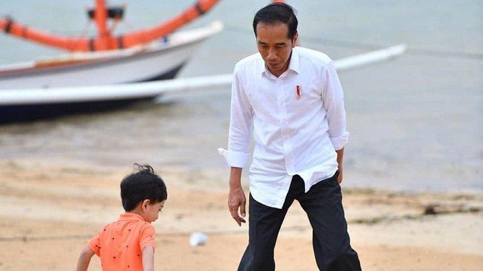 Kebersamaan Jan Ethes bersama Jokowi saat liburan akhir terlihat kala keduanya bermain bola di tepi pantai.
