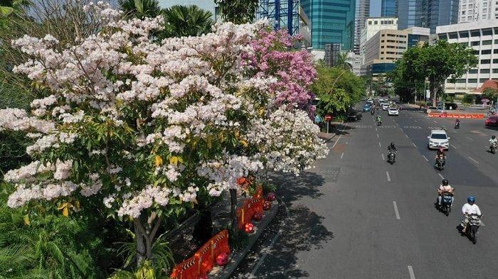 TRIBUNTRAVEL.COM - Warga Surabaya disuguhkan pemandangan indah bunga tabebuya aneka warna yang bermekaran di sejumlah titik pedestrian.