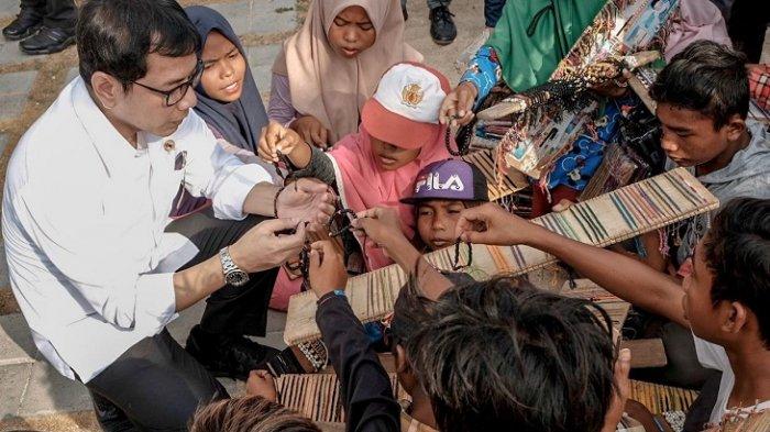 Terlihat para anak-anak mengerumuni Menparekraf Wishnutama dan saling berebutan menawarkan gelangnya.