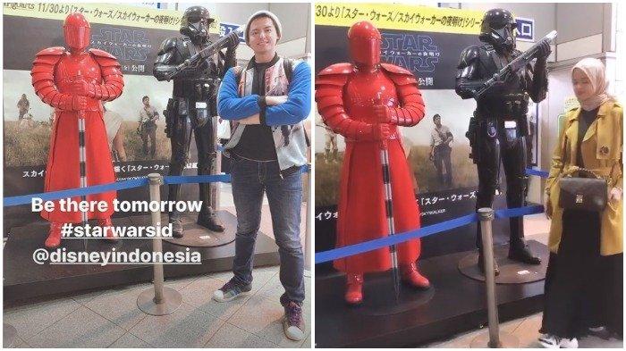 Cut Meyriska tampak berjalan di depan kedua patung dari tokoh film Star Wars.