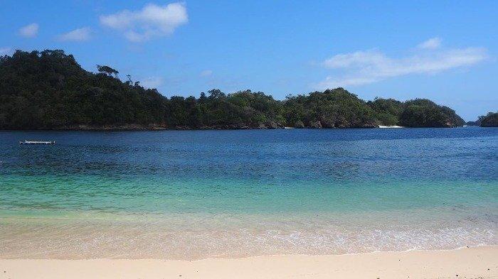 Pantai berpasir putih ini mengelilingi air laut dengan tiga warna yang memukau, yakni biru, kehijauan, dan kekuningan.