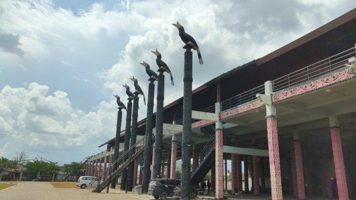 Saat memasuki kawasan Rumah Radakng, mata kalian akan langsung tertuju pada enam tiang besar yang di atasnya bertengger kokoh Burung Enggang Gading.