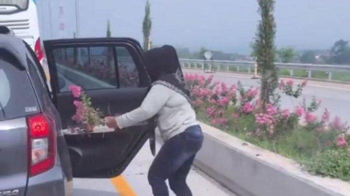 TRIBUNTRAVEL.COM - Seorang perempuan penumpang mobil Daihatsu kedapatan mencuri bunga yang ditanam di median Jalan Tol Pandaan- Malang.