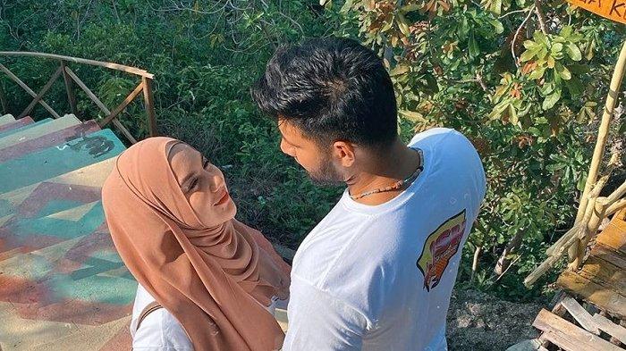 Berpose dengan latar sebuah panorama alam yang menakjubkan, Ammar Zoni terlihat memeluk mesra sang istri.