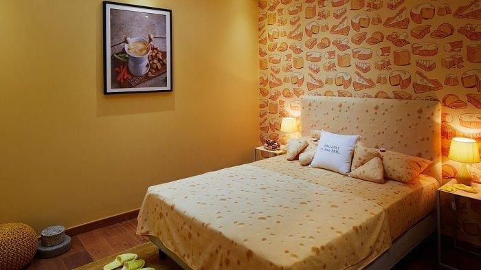 Dilansir dari dailymail.co.uk, suite bertema keju ini menampilkan perabotan bertema keju, wallpaper, bantal bahkan hingg sabun beraroma keju di kamar mandi.