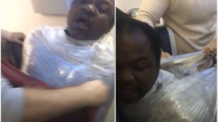 Penumpang bernama Emmanauel Chedjou tersebut dibungkus plastik karena menolak dikembalikan ke negaranya.