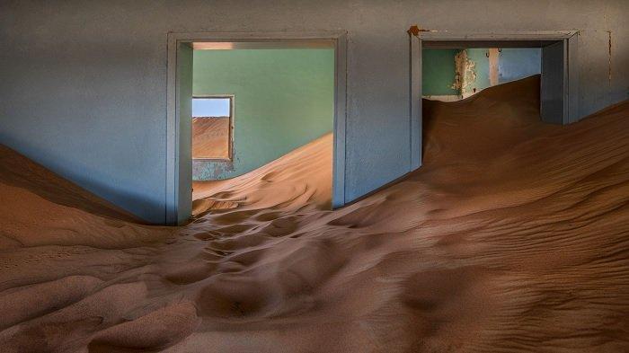 Didorong melalui jendela dan pintu yang terbuka oleh angin, pasir telah memakan dan melapisi interior bangunan-bangunan ini.
