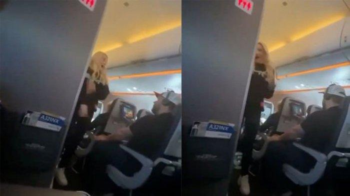 Dalam video yang diunggah tersebut terlihat seorang penumpang perempuan berambut pirang berada di tengah-tengah lorong kabin pesawat.