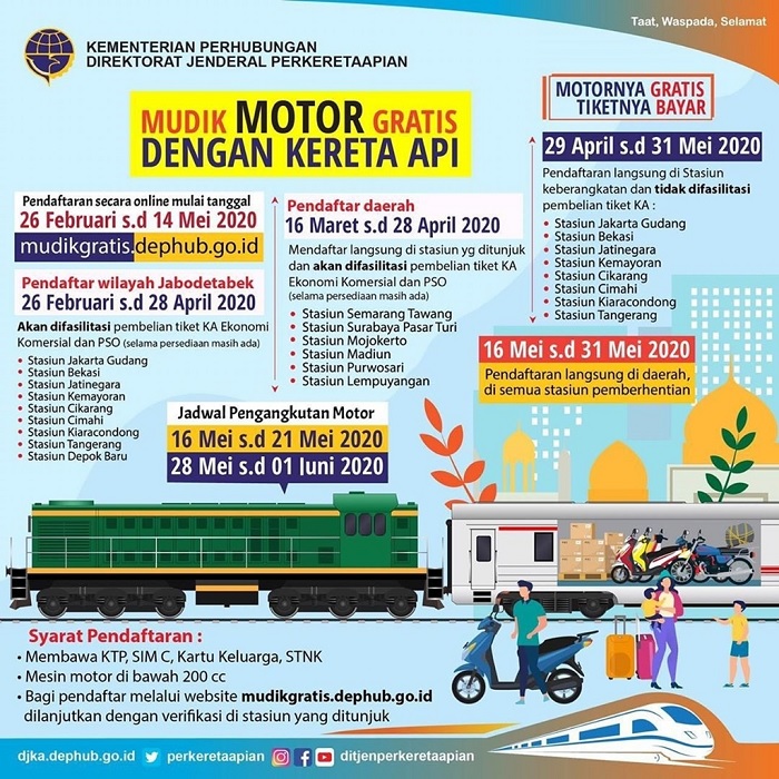 Syarat dan ketentuan terkait pendaftaran Angkutan Motor Gratis bisa dilihat di situs mudikgratis.dephub.go.id, menghubungi Contact Center Kemenhub di 151, atau Instagram @ditjenperkeretaapian dan @motis2020.