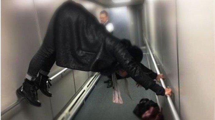 Penumpang wanita yang tak disebutkan identitasnya ini malah mengangkat dirinya dari pijakan skybridge.